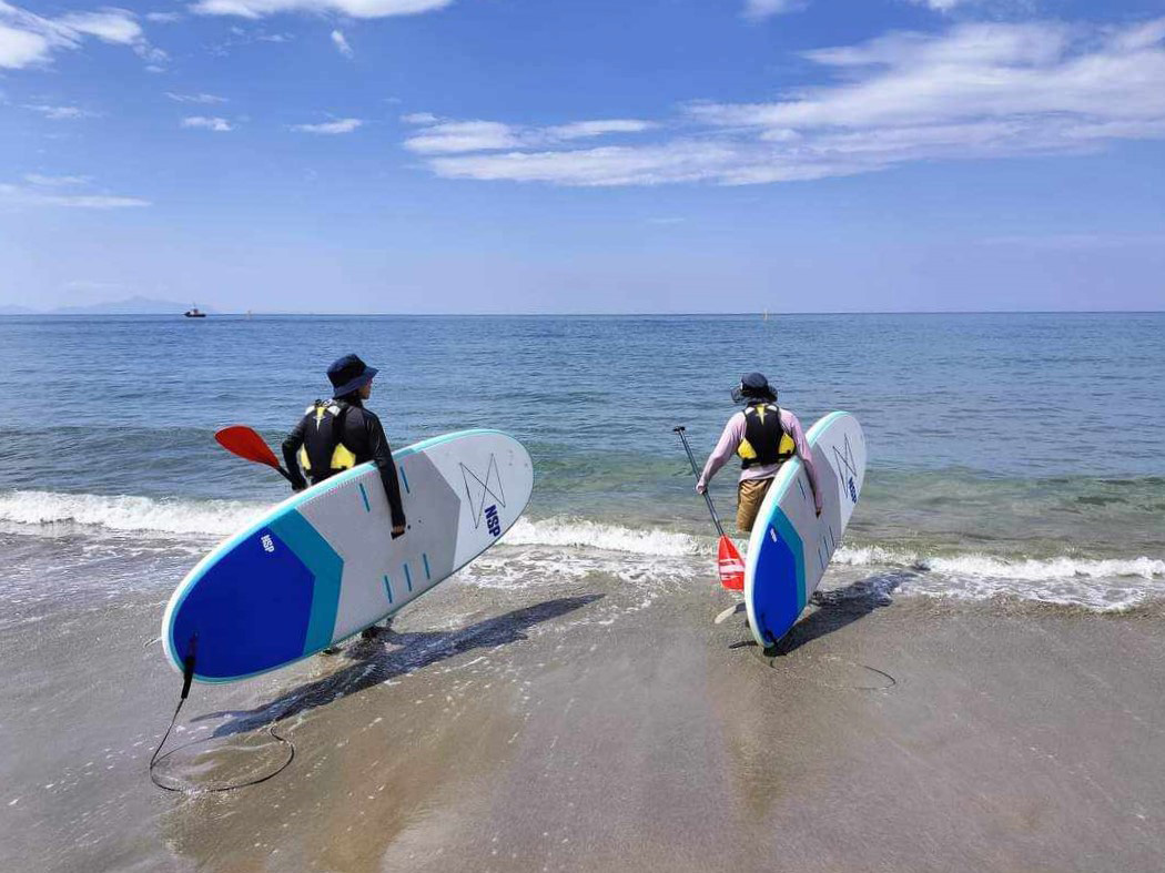 目の前に江口浜が広がる店内には、SUPやサーフィンをはじめ、最新のマリンスポーツ WING(ウイング)やFOIL(フォイル)など各種マリンスポーツ用品を取り揃えており、販売はもちろんレンタルも行っています。